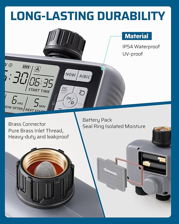 - [User-Friendly & Clear Display] With 2.8" screen, this water hose timer presents watering schedules, battery status, and additional information with clarity; 7 straightforward buttons, configuring your settings takes merely 3 minutes; effortlessly establish the date, start time, duration of watering, and watering frequency for your plants