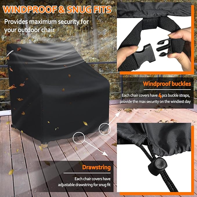 - ADJUSTABLE CORD LOCK: STARTWO lawn furniture covers are designed with elastic hem cords including toggles. Adjustable belted hem with click-close straps provides the patio chair cover a customizable fit with exceptional security in the windiest conditions.