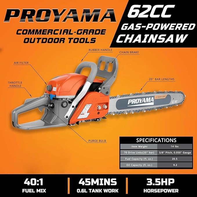 PROYAMA 62CC Gas Powered Chainsaw, 20 Inch 2-Cycle Petrol Handheld Cordless Chain Saw, Gasoline Gas Chainsaws for Tree Wood Cutting