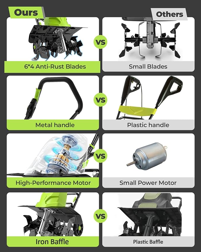- ππππ-ππππ πππππππ ππππππ πππππ The powerful 13.5A copper motor,No-load speed 360RPM. It delivers robust performance and high efficiency. The rototiller can handle large areas of soil or tough ground, easy to finish work in 30 Mins. Equipped with an overload protection system, it automatically shuts off if it is obstructed, preventing damage and extending its lifespan.