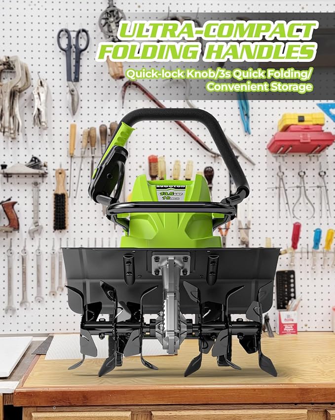 - π πππππππ & ππππππππ Electric rototiller with a humanized design, just press the safety button and switch while working. Weighing just 27.87 lbs, this electric cultivator tiller can be easily lifted with one hand.The foldable handle makes transportation and storage a breeze. These thoughtful details enhance its practicality, convenience, and comfort.