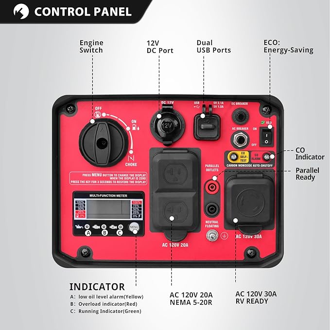 - Panel: Two three-prong 120V 20 Amp NEMA 5-20R receptacle,one 120V 30 Amp RV receptacle, one 12V DC Outlet, two 5V USB ports, parallel ports