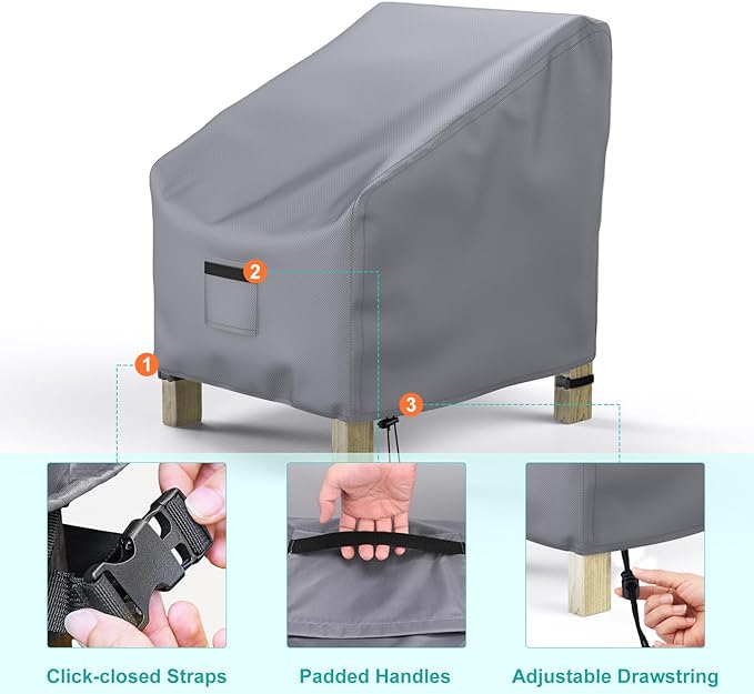 - 【Easy to Set up/ Remove】Our Lawn Chair Covers are designed with 4 Click-close Straps and Cord Lock Closure at the bottom to firmly secure the cover in place, which makes it easier to set up. The Padded Handles on the Air Vent help removing the covers quickly.