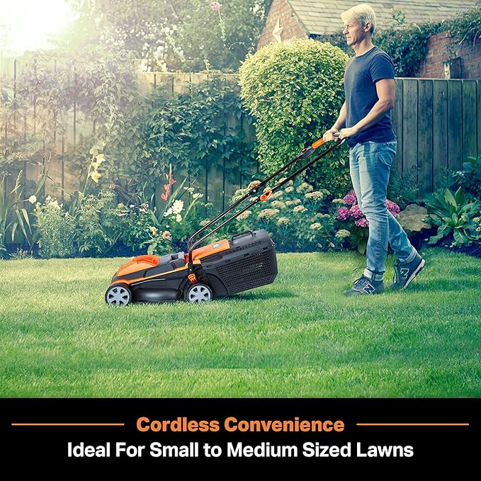 - ULTIMATE CONVENIENCE: Mower features a carrying handle to provide lightweight transportation while the push handles fold for compact storage