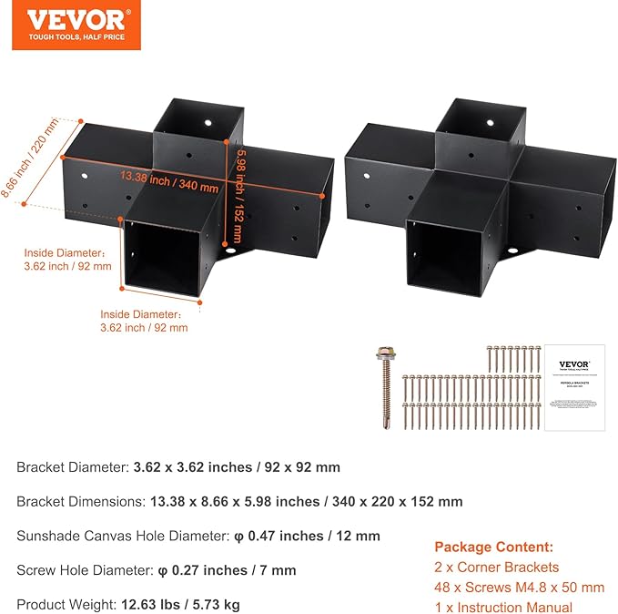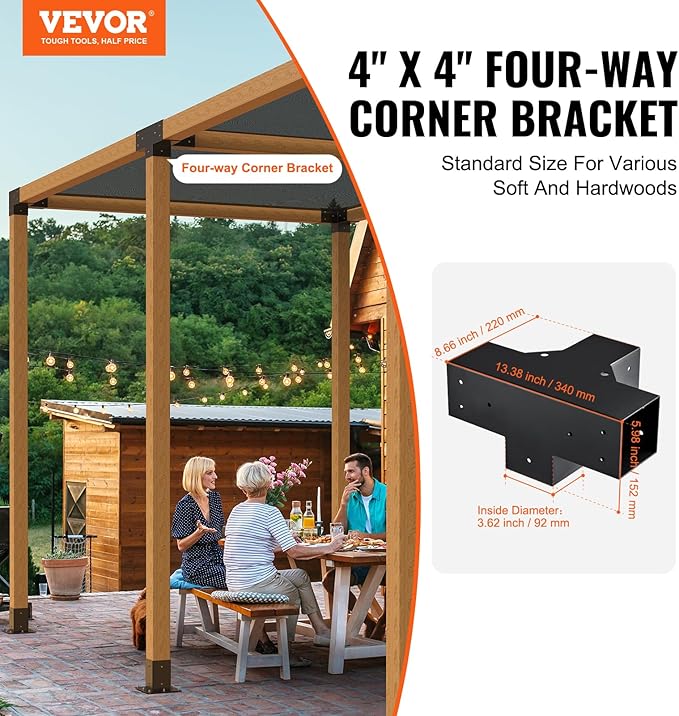 - 4" x 4" Four-Way Pergola Brackets: This durable and strong pergola bracket kit that covers wooden beams, preventing them from rotting due to rainwater and harsh sunlight. It is designed for the mainstream 4" x 4" specifications and can accommodate actual dimensions of 3.6 x 3.6 inches (92 x 92 mm) for both soft and hardwood.