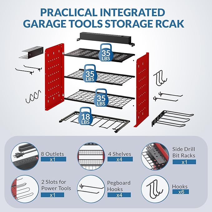 Power Tool Organizer with Charging Station, 4 Layers Garage Storage Rack with 6 Drill Holders, Father's Days Gift For Dad, Wall Mount Garage Organizer Built in 8 Outlets Power Strip, Red