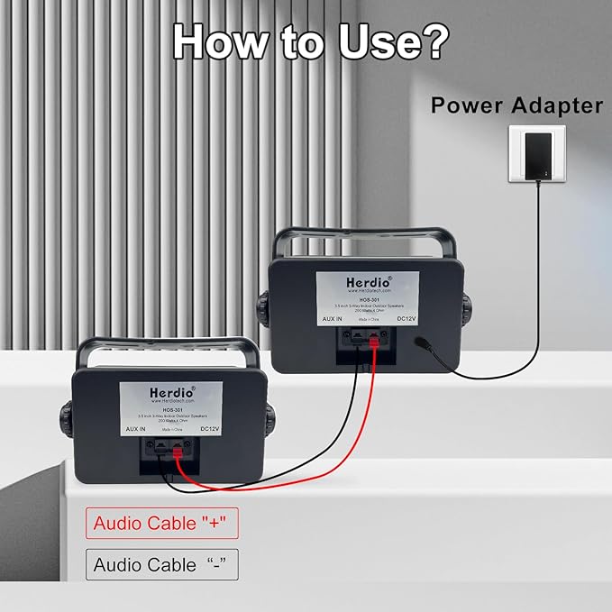 - 【WHAT’S in THE BOX & Herdio SERVICE】1* Active Outdoor Speakers, 1* Passive Outdoor Speakers, PWR-12V3A *1, Speakers Cables (5m) *1, Owner's manual *1. Herdio provides Lifetime Support with our Professional Customer Support team. If it’s a technical question or a basic question we’ll be more than happy to help