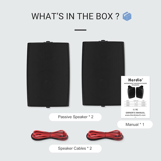 - What you get: 2x outdoor Speakers, 2x Speakers Cables(16.4Feet/5m) 1*User's Manual.Note:These speakers set are two passive outdoor speakers, so it does not include power adapter.
