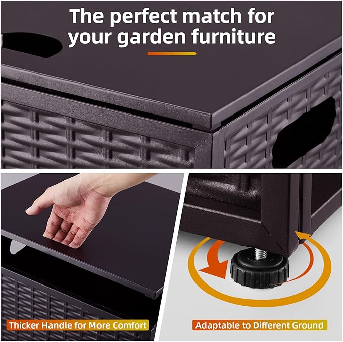 - 【Convenient and Functional Design】Featuring an upper cover opening for easy access to the gas tank and side handles for effortless movement, the propane tank cover table ensures convenience and practicality. Additionally, the adjustable feet maintain balance and stability.