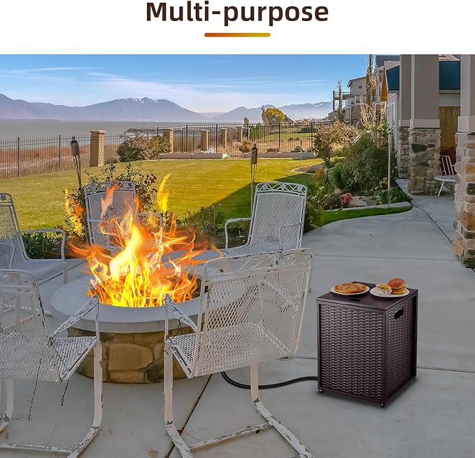 - 【Dual Functionality】This gas tank hideaway table not only conceals and protects the propane tank but also serves as a functional outdoor side table when closed. It provides a convenient surface for placing food and drinks while enjoying time around the fire pit.