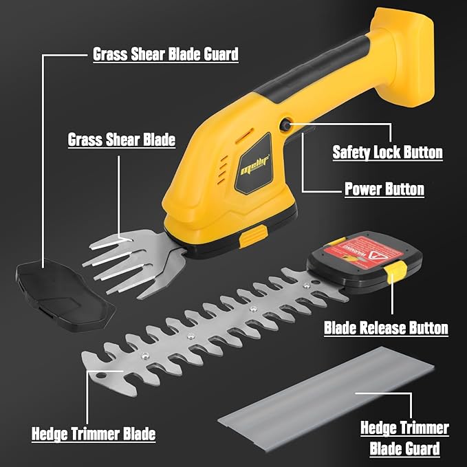 - Effortless 2-in-1 Hedge Tool: Featuring both a long hedge trimmer blade and a wide grass shear blade, our handheld tool offers easy blade swapping with just a button push. Blade guards ensure peak performance during storage, prolonging blade life