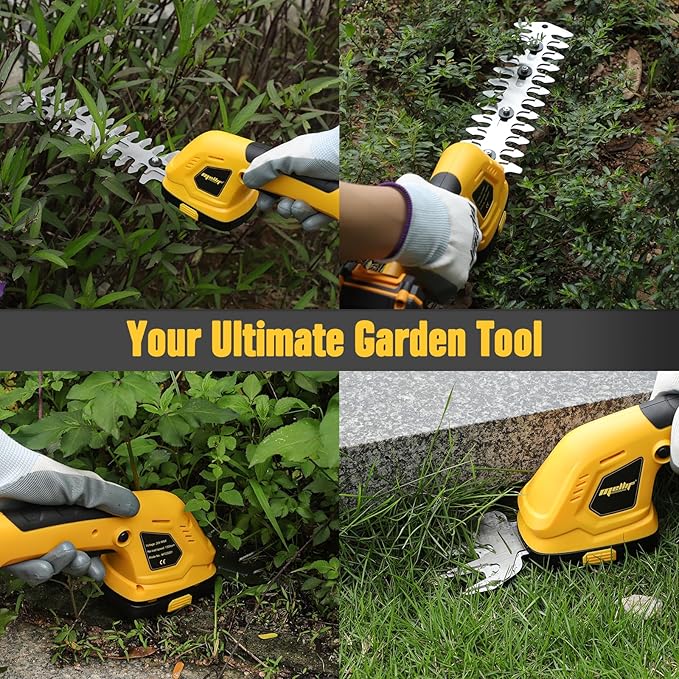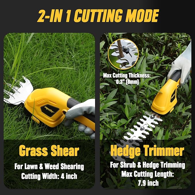 - Improved Cutting Precision: With two sharp blades β a 7.9" hedge trimmer blade with a max cutting thickness of 0.3" for thin shoots on bushes, small trees, and twigs, while the 4" wide grass shear blade efficiently trims grass, weeds, garden edges, and small sections of lawns. Handle various tasks with ease