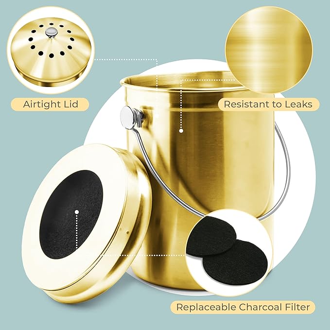 - EASY TO CLEAN & RESISTANT TO LEAKS: Our one-piece molded counter compost bin with lid, resists rust and leaks, making it easy to clean and maintain. Say goodbye to welded bins that deteriorate over time.