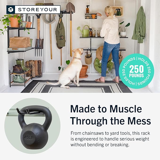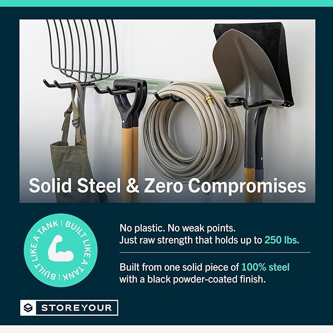 - RECLAIM YOUR GARAGE – Conquer clutter with this garden tool organizer designed for garage storage, sheds, or workshops. Measuring 36" L x 9.5" W x 2.5" H, it features four PVC-coated garage hooks and a 250 lb weight capacity, ideal for storing shovels, brooms, rakes, and power tools. Installs with 3 heavy-duty lag screws directly into 16" wall studs for secure, long-lasting support.