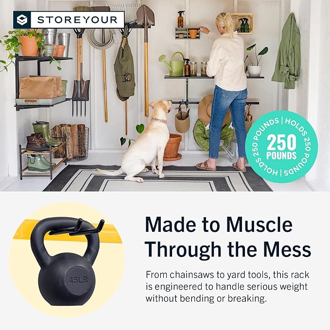 - RECLAIM YOUR GARAGE – Conquer clutter with this garden tool organizer designed for garage storage, sheds, or workshops. Measuring 36" L x 9.5" W x 2.5" H, it features four PVC-coated garage hooks and a 250 lb weight capacity, ideal for storing shovels, brooms, rakes, and power tools. Installs with 3 heavy-duty lag screws directly into 16" wall studs for secure, long-lasting support.