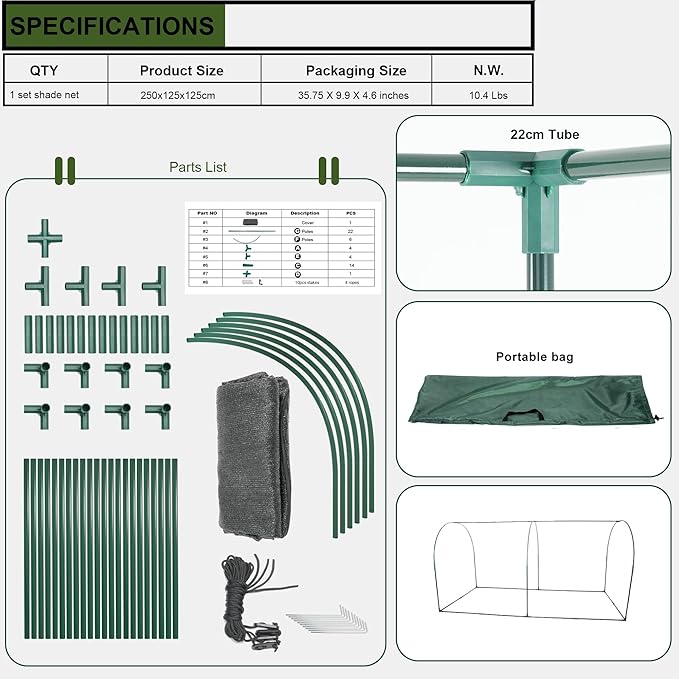 - Large size and portable packaging - Large Size & Portable Packaging-length 250cm width 125cm and height 125cm / 98.4x49x49inches and each tunnel sunshade net weight has 4 kg/8.8lbs ,the garden netting cover can be put in 85cm/33.4 inches carry bag easy to portable