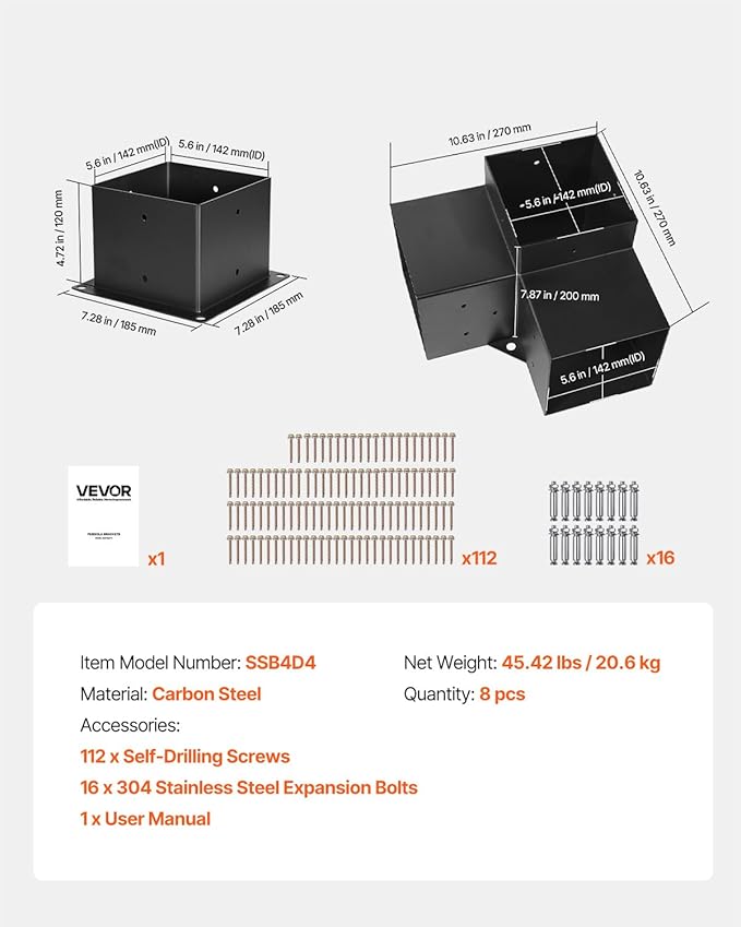 - Strong Fixation: The pergola bracket kit features upgraded stainless steel expansion screws with high hardness and corrosion resistance for lasting strength. Extended to 60 mm, the anchors provide secure installation on concrete, wood, and other surfaces