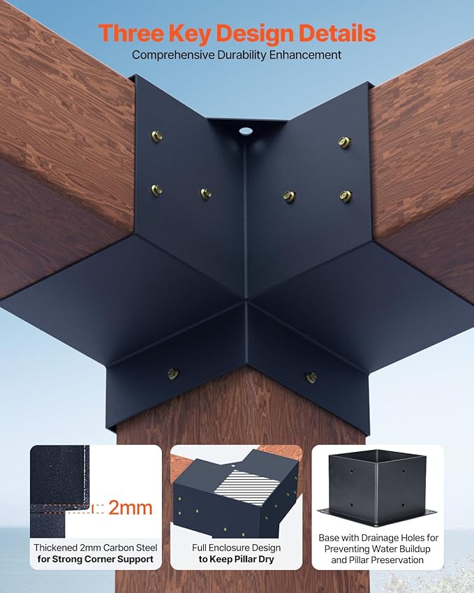 - Enhanced Durability: This pergola hardware is built from 2 mm carbon steel with a black powder coating for corrosion resistance. The reinforced 90Β° boot structure avoids breakage and deformation, while the full-coverage design shields posts from rain. Integrated drainage holes also help extend lifespan