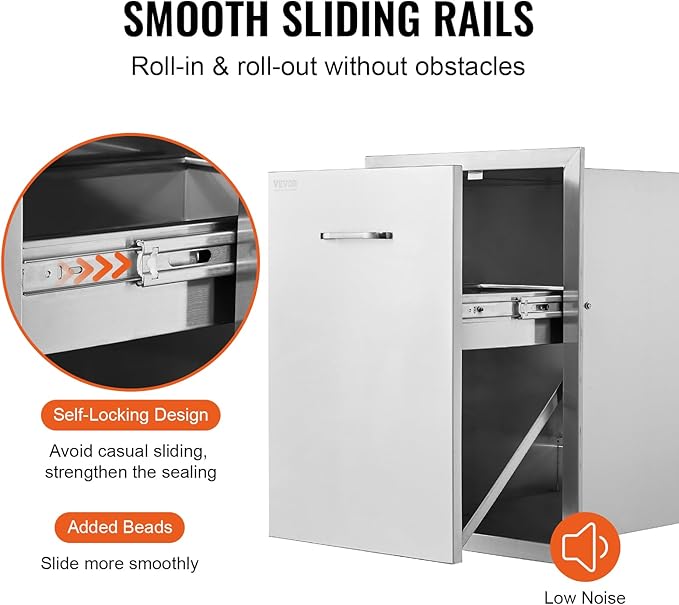 - Smooth Sliding Rails: With silent sliding rails, our outdoor drawer can provide a pleasant family atmosphere with no irritating noise. Compared with others, ours adds beads which is smoother to roll-in and roll-out. Additionally, the stable open-close design keeps dishes fixed in place.