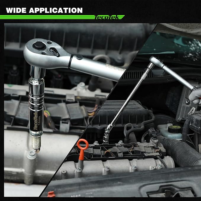 - ✅【Size Include】10-45 Ft-Lbs (13.5-61Nm) click torque wrench, 12pt magnetic swivel spark plug socket: 14mm, 16mm, 6pt non-magnetic spark plug socket: 9/16-inch, 5/8-Inch, 3/4-Inch, 13/16-Inch, 18mm, spark plug gapper, universal joint and 10" long extension bar. It's a high quality set for DIY spark plug removal and installs.