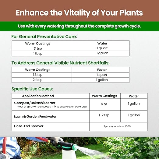 - EASY TO USE: For general preventative care, mix 1 tablespoon of worm castings fertilizer per gallon of water and apply every watering to give your plants the nutrients they need for optimal growth.
