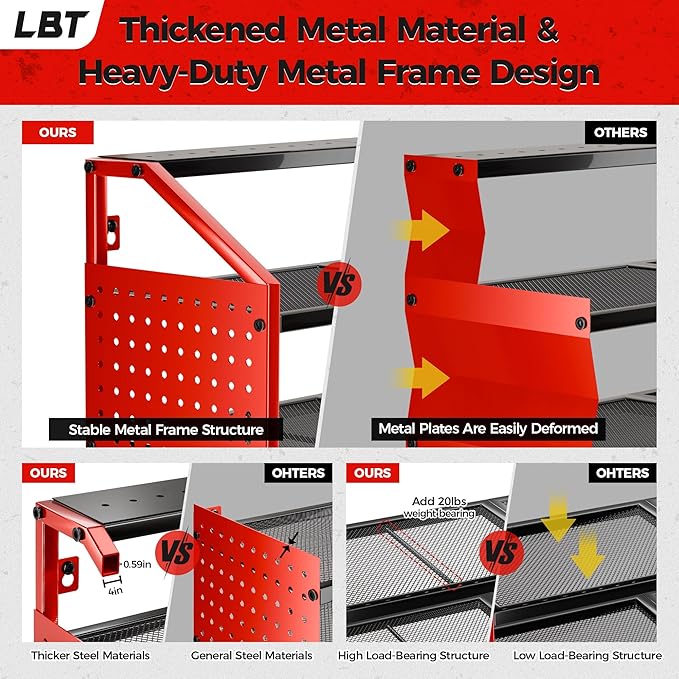 - 【3+1 Floor - More Space】The tool storage for garage organization is equipped with perforated panels on both sides to increase a large amount of hanging space. 26 inches long,16 inches high, 9.5 inches wide, 6 drill holders size, Larger size design allows LBT tool rack to accommodate more charging device and large tools