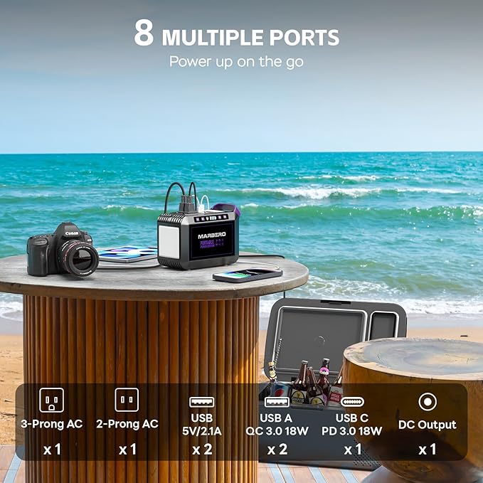 - SOLAR GENERATOR WITH SOLAR PANEL: Looking for a reliable power solution for your outdoor adventures? Look no further than the MARBERO Solar Generator M822MAX paired with the MARBERO 40W Solar Panel. Whether you're camping in the wilderness or embarking on a road trip, this powerful duo ensures you have access to electricity wherever you go. With its large capacity, this portable power kit is perfect for overnight stays or extended periods off the grid. Say goodbye to worrying about charging your devices and hello to uninterrupted outdoor fun!