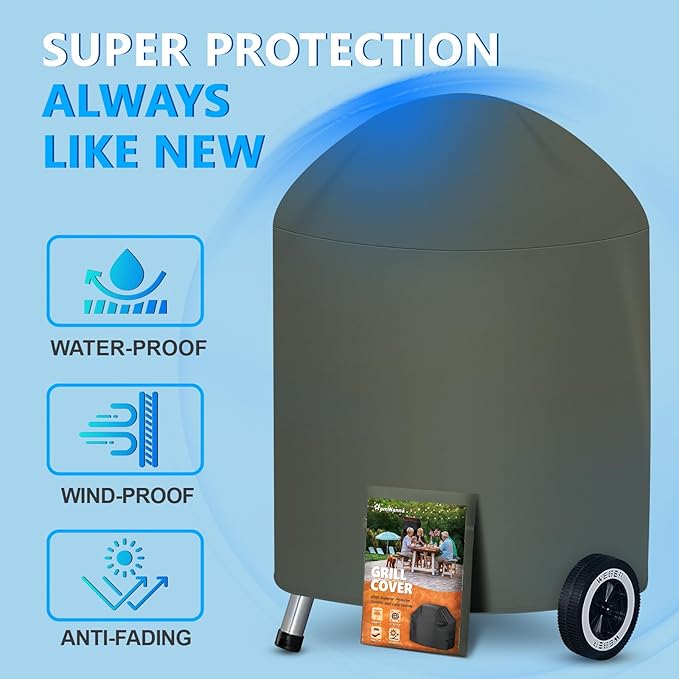 - [ Super Heavy-Duty 22 Inch Grill Cover ] - Made of 600D premium oxford cloth with thickened PVC coating, HomWanna kettle grill covers are super durable and heavy-duty. Measure: 27"L x 25"D x 35"H, this charcoal grill cover is perfect to fit Weber 22 Inch kettle charcoal grill, 22 Inch Jumbo Joe charcoal grill and most other 22" charcoal grills. (For other grill model, please check the size carefully.)