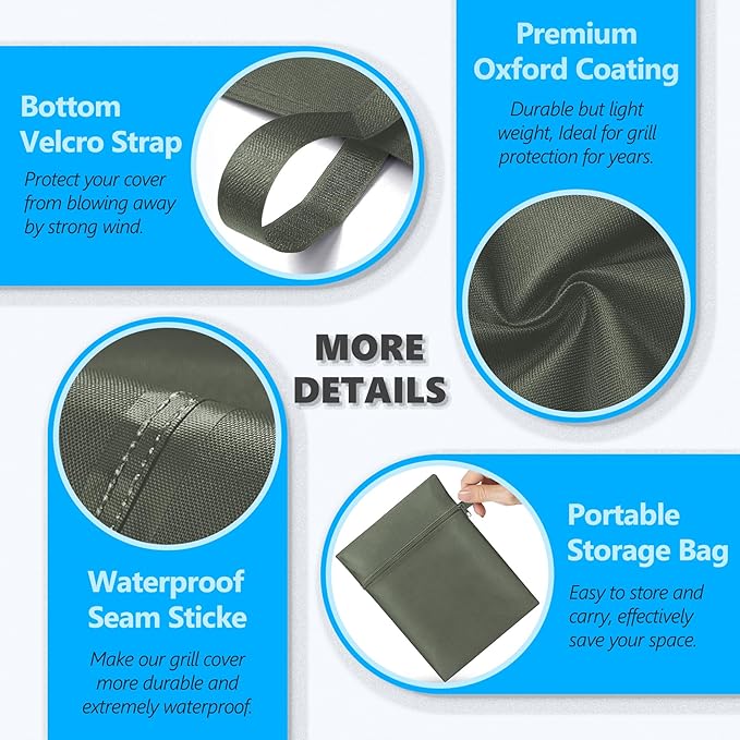 - [ Extremely Waterproof & Fade-Resistant ] - 600D high density finish with inner PVC polyester material makes our grill covers extremely waterproof even in stormy weather. The rainwater will slide off from the surface of the cover so as to keep your grill dry and prevent rusting. After precise processing of UV resistance, we are confident that our grill covers are fade-resistant after many years of use.