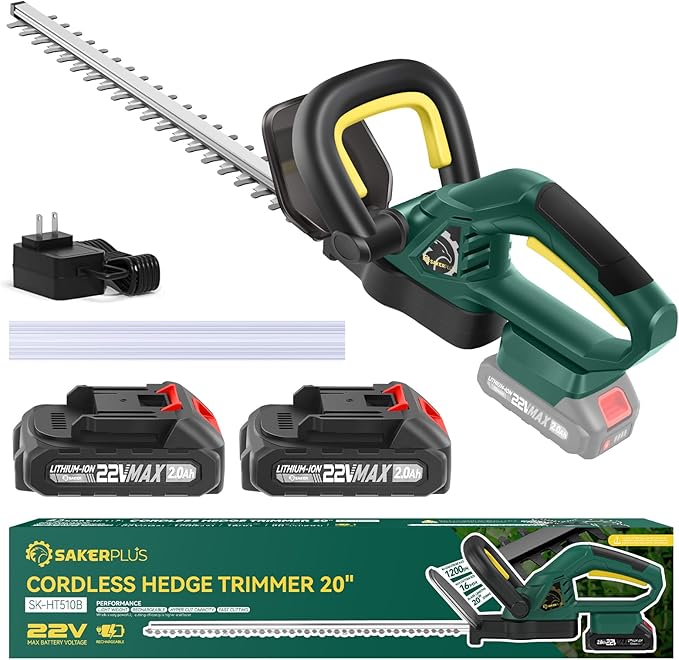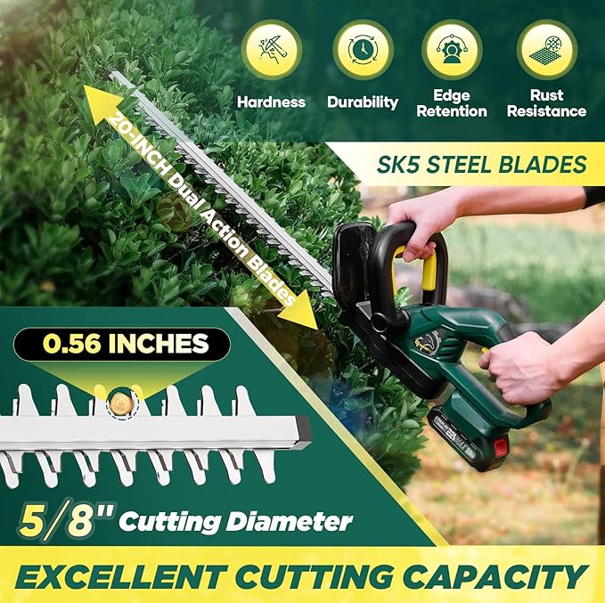 - 【SUPERB CUTTING ABILITY】Equipped with 20-inch Dual-Action blades, the SakerPlus cordless hedge trimmer ensures smooth, low-vibration trimming. Its double-action blade design efficiently cuts forward and backward, ensuring every branch and twig is neatly trimmed. With a cutting capacity of up to 0.6 inches thick, it delivers precise results with ease.