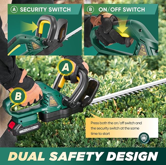 - 【ENHANCED SAFETY FEATURES】At SakerPlus, user safety is our utmost concern. Our hedge trimmer features a double-lock design to ensure your protection at all times. This battery-powered hedge trimmer activates only when you simultaneously press the top handle and the switch, minimizing the risk of accidents. Additionally, its high-quality shell provides added protection against accidental injuries from the sharp blades.