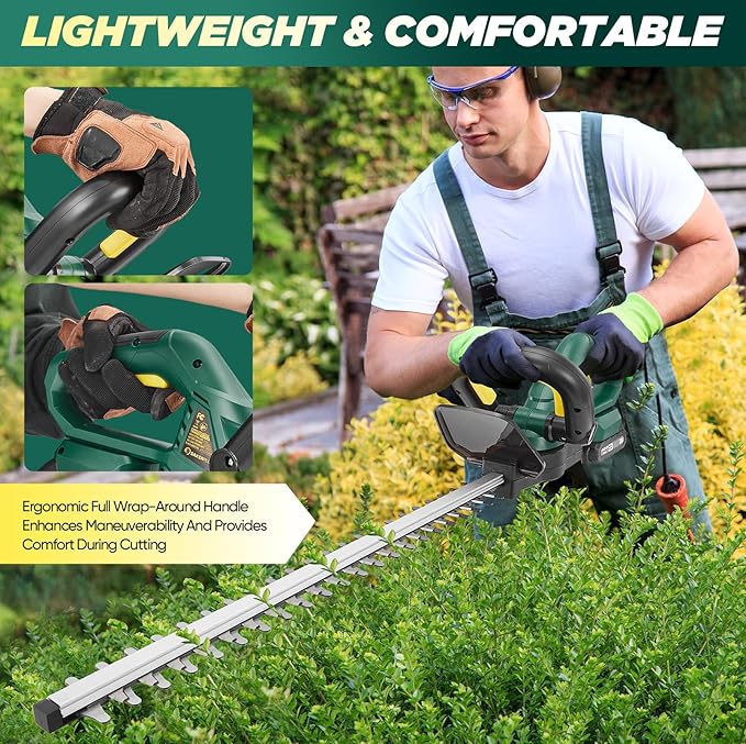 - 【LIGHTWEIGHT & ERGONOMIC】Weighing just 5.7 lbs, the SakerPlus hedge trimmer cordless with battery is easy to handle, allowing you to lift it effortlessly, whether high or low, without feeling fatigued or uncomfortable. Its ergonomic wrap-around handle ensures a comfortable grip, making trimming tasks easy and enjoyable, especially ideal for seniors and women.