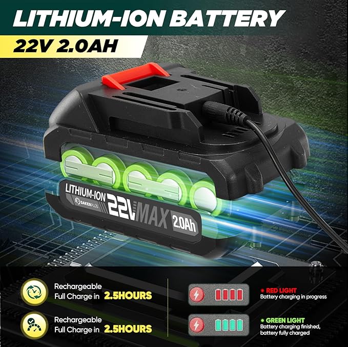 - 【RECHARGEABLE BATTERY WITH INDICATION】The SakerPlus electric hedge trimmer includes a 22V/2000mAh lithium-ion battery and fast charger, enabling cordless outdoor cutting. With up to 60 minutes of continuous operation on a full charge, monitor the battery level to ensure uninterrupted gardening or pruning tasks with your SakerPlus grass shear.