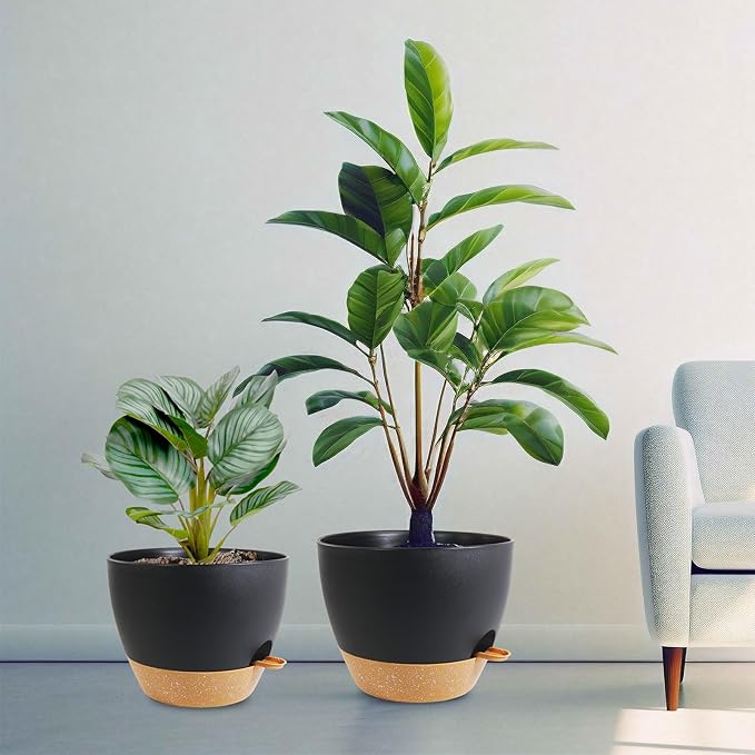 12/10/9 inch Large Self Watering Pots, Planter, Plant Pots with Mesh Drainage Holes for Indoor Outdoor Garden Plants, Plastic Flower Pots with Removable Deep Reservoir, Black with Brown