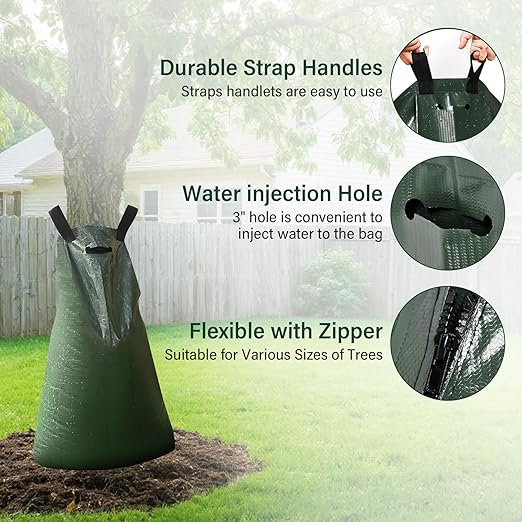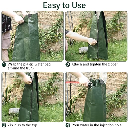 - Easy to Use: Place the slow release water bag around the bottom of the trunk, tighten the zipper and pour water in it. And tree water bags can be zipped together freely for planting larger trees