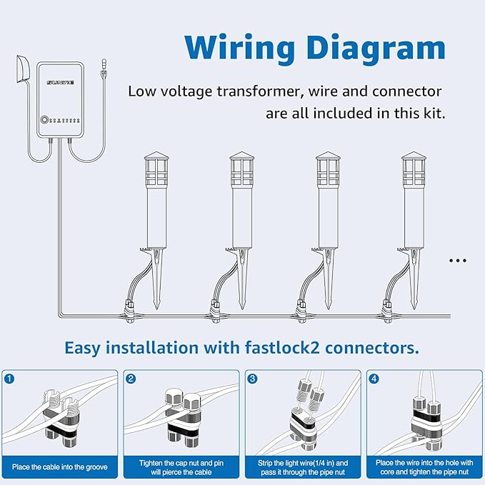 - 【Flexible Lighting Layout】Unlike other kits with fixed length male and female plug cords, with our kit you can place each light anywhere along the 100 feet of low voltage wire. And no need to worry about wiring, the included SUNVIE patented fastlock2 connectors make it a breeze.