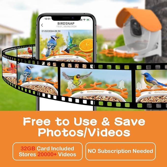 - 【Ideal Gift for Bird Lovers】birdsnap video bird feeder camera makes the perfect gift for birdwatching enthusiasts of all ages. It provides a 32GB Storage Card and cloud storage, allowing you to share beautiful bird moments with family and friends. Strengthen family bonds and create lasting memories with the joy of birdwatching together.