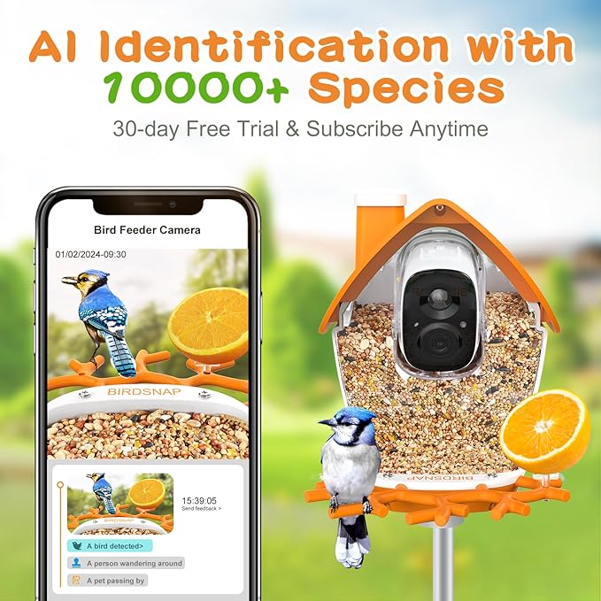 - 【Advanced 10000+ AI Bird Identification】Our smart bird feeder with camera can recognize over 10,000+ bird species using advanced AI technology. You can learn more about each identified bird by subscribing to our service. Whether a novice or an experienced bird watcher, Birdsnap enhances your birdwatching journey with educational insights