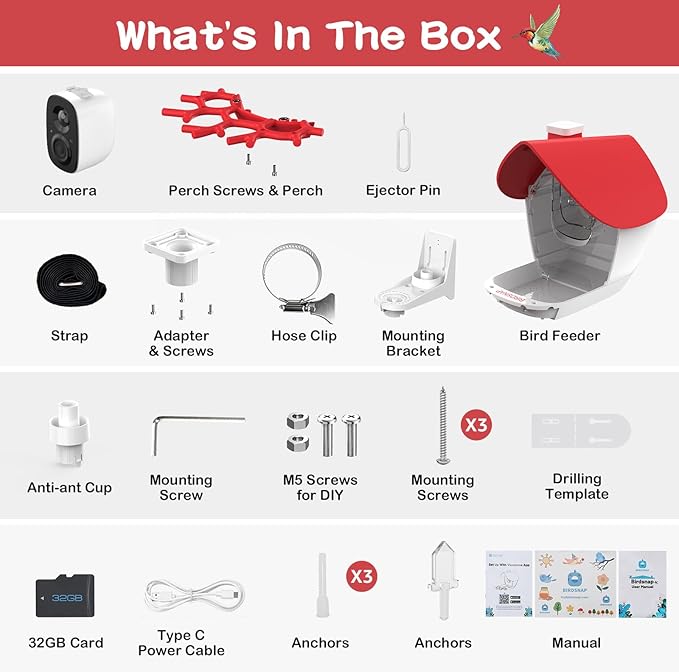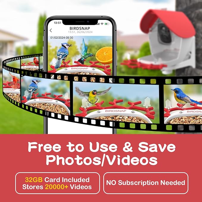 - 【Ideal Gift for Bird Lovers】birdsnap video bird feeder camera makes the perfect gift for birdwatching enthusiasts of all ages. It provides a 32GB Storage Card and cloud storage, allowing you to share beautiful bird moments with family and friends. Strengthen family bonds and create lasting memories with the joy of birdwatching together.
