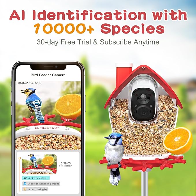 - 【Advanced 10000+ AI Bird Identification】Our smart bird feeder with camera can recognize over 10,000+ bird species using advanced AI technology. You can learn more about each identified bird by subscribing to our service. Whether a novice or an experienced bird watcher, Birdsnap enhances your birdwatching journey with educational insights