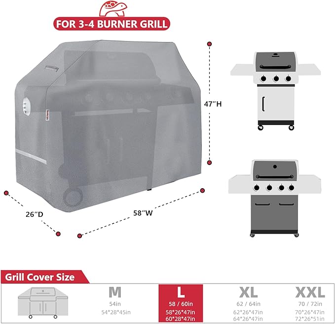 - 【Dimension and Premium Material】- Measures: 58"(W) x 26"(D) x 47"(H). Heavy-duty Oxford with new upgrade PVC coating. Fits most bbq grills with 3-4 burners. Please confirm the measurement of your grill before purchasing.