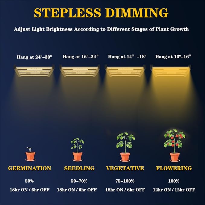 - 【STEPLESS DIMMABLE DESIGN】This hanging grow light designed with a dimming knob, you can adjust the brightness freely just as your plants growth stage, easily to operate. And this led growing lights with high energy efficiency, better light penetration. Ideal for hydroponic indoor seeding veg bloom greenhouse growing. Perfect for 2x2 ft tent.