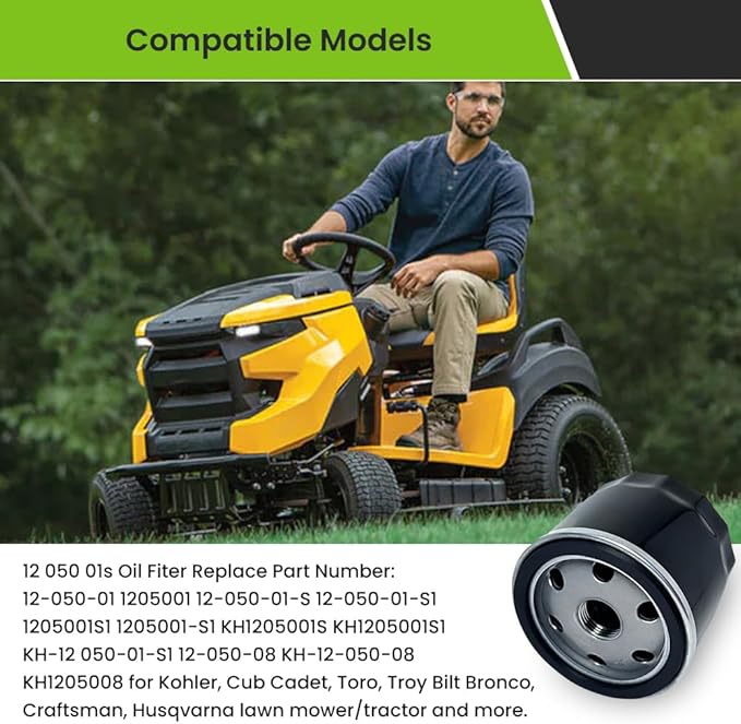 - Wide Compatibility: 12 050 01-S engine oil filter for riding mower, XT1 Enduro Series; for Troy Bilt Riding Lawn Mower, LTX1050,24 HP KT-735, LT-54; for Cub Cadet KH-12-050-01-S CC-12-050-08,1500 and 2000 series lawn tractors engines, XT1 XT2-series, YTH20K46 YTH21K46, 531 30 73-93 531307393; for Craftsman 24604, 42 inch mower; for Gravely, Toro, Hustler, Troy Bilt mower tractor engine; for Craftsman MTD Yard Man Toro Lawn Tractor, SV710, SV715, SV720, SV730, SV735 and SV740 engine; for Cub Cadet 1500 and 2000 series lawn tractors with engines,1000Z, IS2000Z, IS3000Z and IS3100Z; for Toro 74610 74603 74701 74702 79104 74255 74261 74262 74263 74282 74283 74284 74291 74412 74414.
