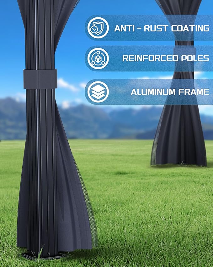- 【Sturdy Aluminum Frame】Our outdoor hardtop gazebo is made of powder-coated aluminum frame, resistant to corrosion, rust, and fading. The feet have holes and grounding stakes, requiring the installation of ground nails or expansion bolts to reinforce the pavilion for improved stability.