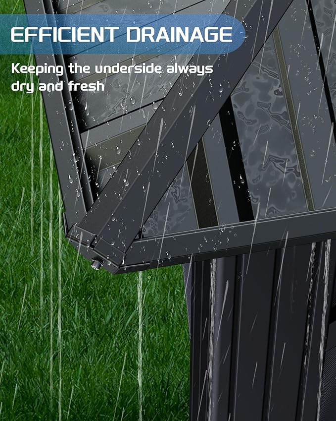 - 【Double-Roof Hardtop Gazebo】The galvanized iron top of this hardtop gazebo 12x12 can be used in any weather, extending its lifespan. Rainwater flows through the eaves leak holes into the ground, reducing the hassle during the rainy season. The double-roof design allows for better ventilation, cooling, and lower wind speed.