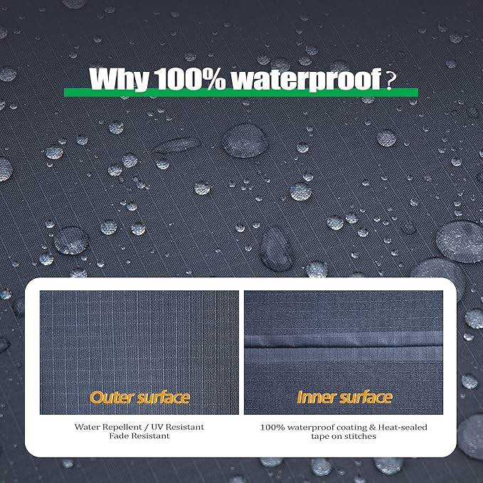 - PATIO FURNITURE COVERS WATERPROOF UV-RESISTANT: Tightly woven material with innovative coating + heat tape sealed seams.