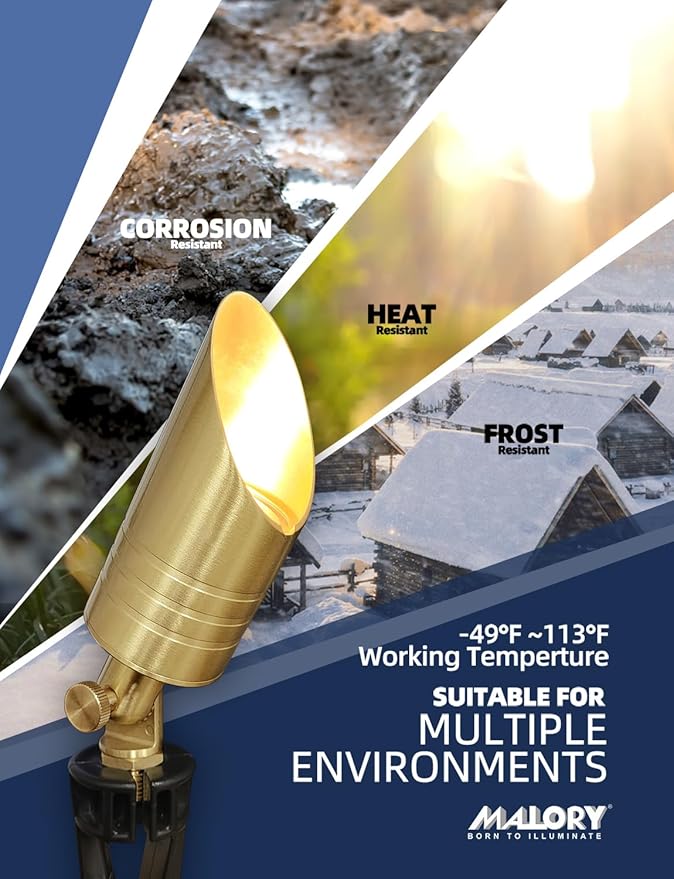 - BRASS LIGHT FIXTURE:MALORY landscape spotlight is constructed of die-cast brass for durability and beauty.Brass spot light doesn't corrode,more durable and reliable than aluminum and plastic fixtures,ideal for any uplighting application.Simple design structure for the light fixture make it looks beautiful yet unobtrusive in any landscape,suitable for decorating most houses and yards.