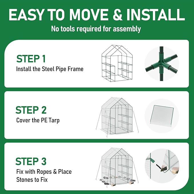 - Rain and Snow Prevention: When it rains or snows, closing the door and side windows. The thicken PE cover can effectively protect plants from being exposed to rain or crushed by snow. It can also protect plants from being disturbed by flying objects