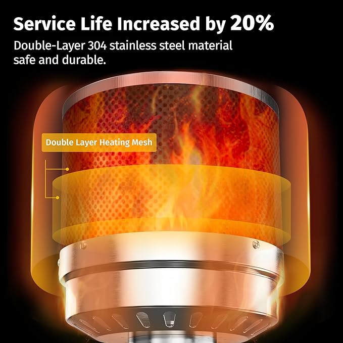 - ๐ ๐ผ๐ฟ๐ฒ ๐๐๐ฟ๐ฎ๐ฏ๐น๐ฒ ๐๐ผ๐๐ฏ๐น๐ฒ-L๐ฎ๐๐ฒ๐ฟ ๐๐ฒ๐ฎ๐๐ถ๐ป๐ด ๐ ๐ฒ๐๐ต: High-quality 304 stainless steel is engineered into our double-cover heating mesh design. Compared with a traditional single-layer burning mesh heater, the EAST OAK Outdoor Heater is more powerful, durable, and safer. All these improvements deliver a 30% longer product life