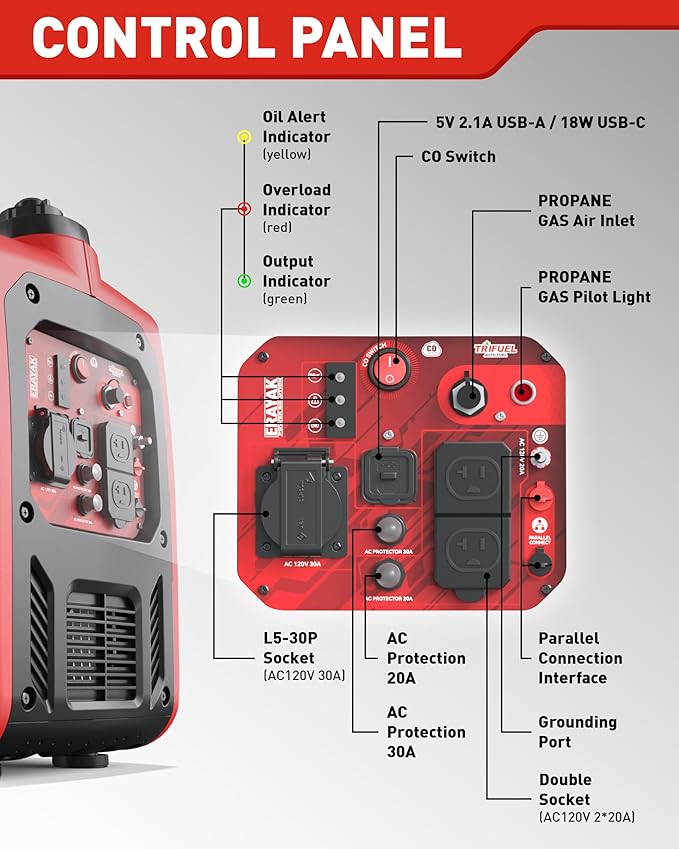 - Clean & Reliable Power for Home & RV β The Erayak 4500PD inverter generator delivers 4,500W peak and 3,500W running power with pure sine wave technology (THD 0.2%~1.2%), ensuring safe operation for sensitive electronics. Ideal for home backup, RVs, trucks, campers, and outdoor adventures, it features two 120V/20A outlets, a 30A (L5-30P) RV outlet, USB-A (5V 2.1A), and 18W USB-C to meet all your power needs.
